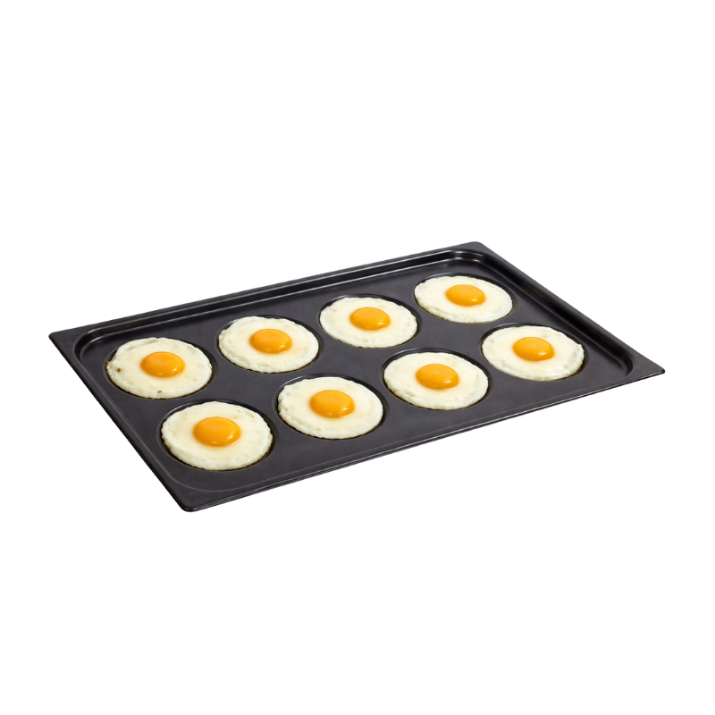 Assadeira para preparo de ovos com revestimento antiaderente em teflon, no padrão 1/1 GN, desenvolvida para utilização em fornos combinados. Ideal para o preparo de até 8 ovos fritos ou omeletes de forma simultânea, sem a necessidade de utilizar gordura.
