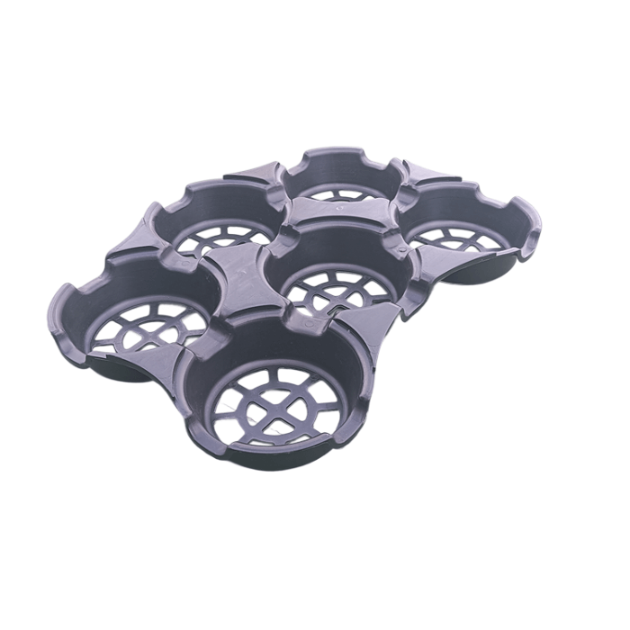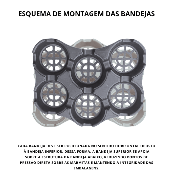 O projeto interno foi desenvolvido para preservar a integridade das embalagens durante o transporte. Para garantir melhor apoio estrutural e estabilidade térmica, recomenda-se que, na montagem dentro das caixas térmicas, cada bandeja seja posicionada no sentido horizontal oposto à bandeja inferior. Dessa forma, a bandeja superior se apoia sobre a estrutura da bandeja abaixo, reduzindo pontos de pressão direta sobre as marmitas e mantendo a integridade das embalagens.