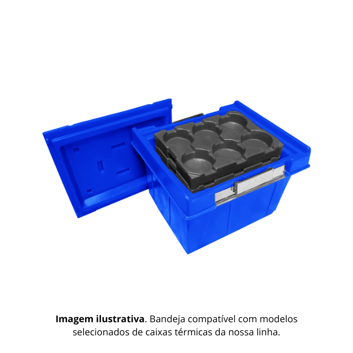 O modelo conta com alças integradas para facilitar o manuseio, agilizando o carregamento e descarregamento das refeições. Além de proteger a integridade das marmitas, a bandeja auxilia na organização interna da caixa térmica e contribui para a manutenção do desempenho térmico do conjunto.