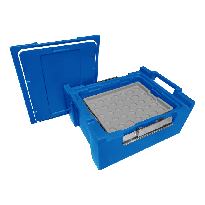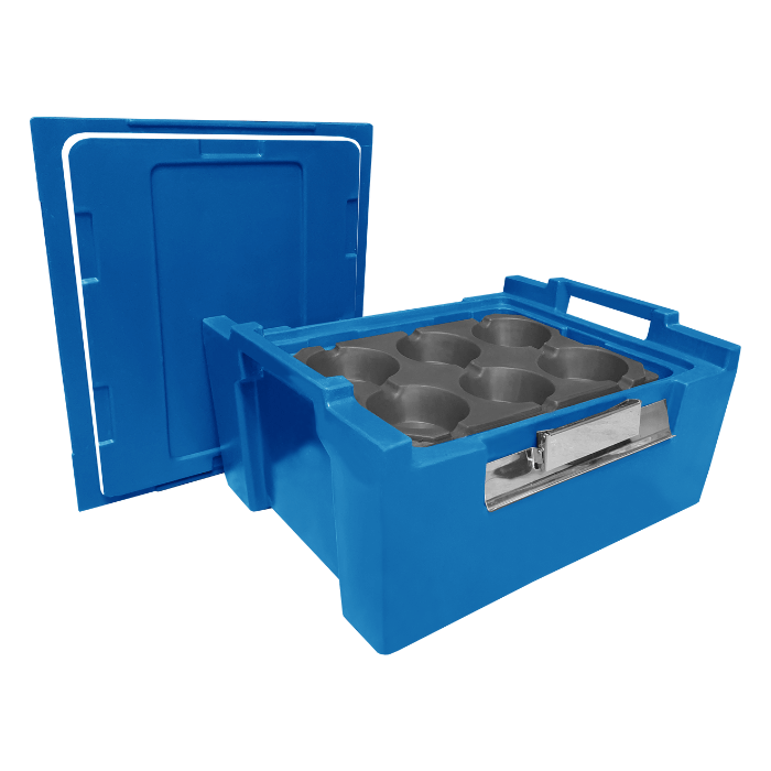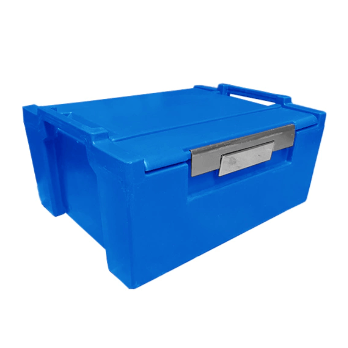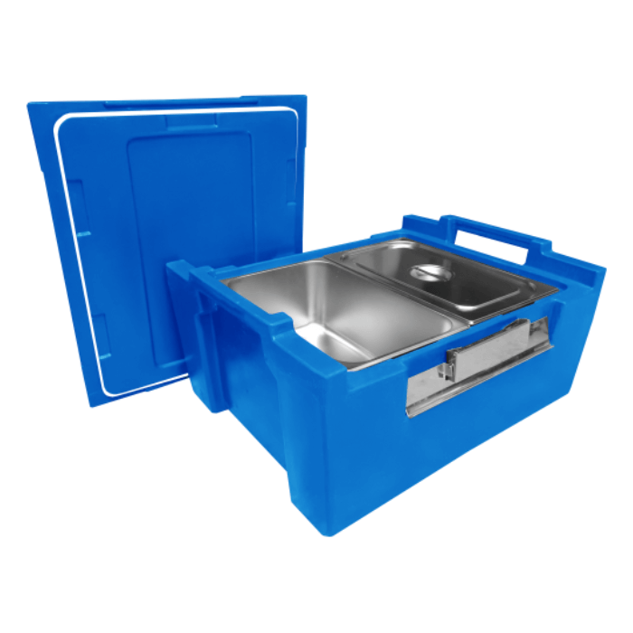 Dispõe de alças laterais, facilitando o transporte e o manuseio com segurança. Seu design favorece a fácil higienização, permite empilhamento quando fora de operação e contribui para a organização logística das operações de transporte de refeições.