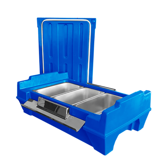 Para otimizar o transporte, o manuseio e a conservação do produto, dispomos de carrinhos específicos para movimentação da caixa térmica, bem como pallets plásticos, recomendados para armazenamento elevado do solo, em conformidade com as boas práticas sanitárias e facilitando a limpeza e organização do ambiente.